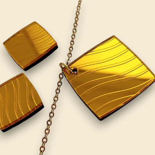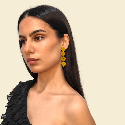 Diseños geométricos, brillo espejo, mucho dorado y plata. Pendientes grandes y ligeros....