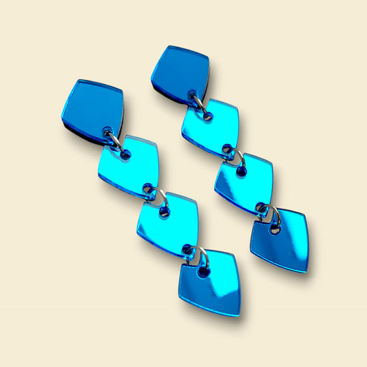 Diseños geométricos, brillo espejo, mucho dorado y plata. Pendientes grandes y ligeros....
