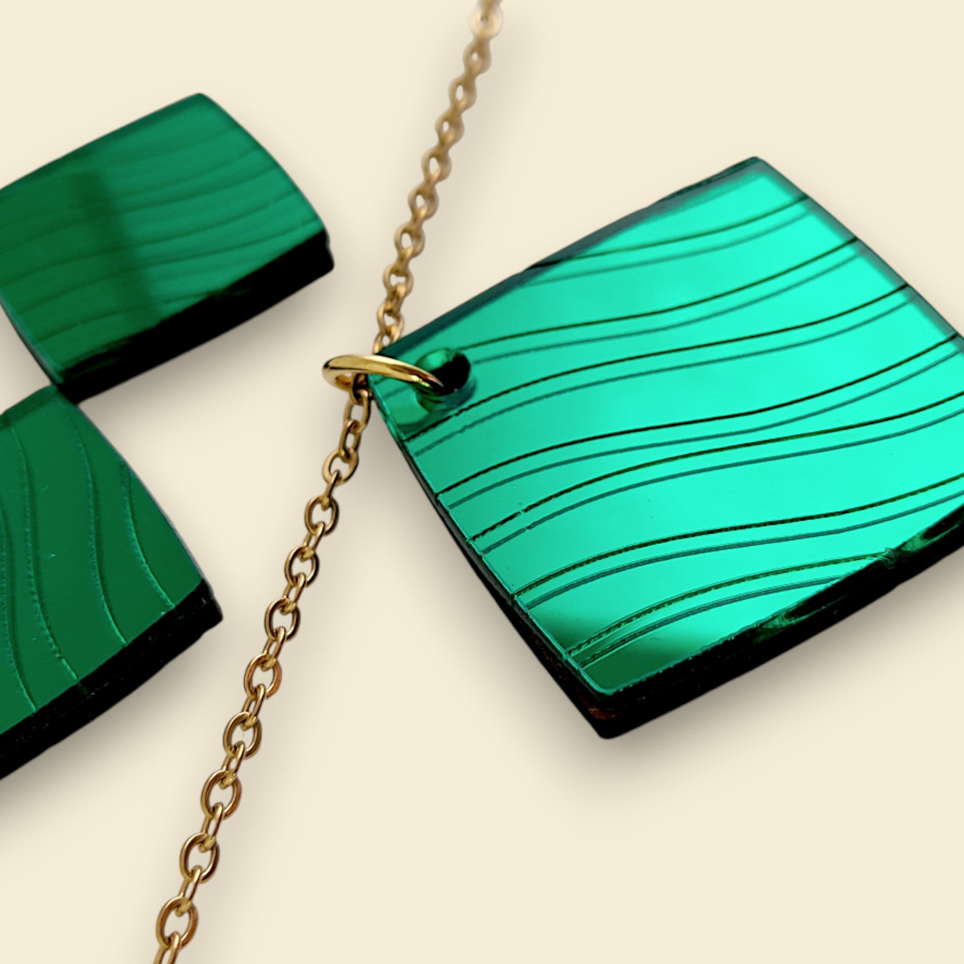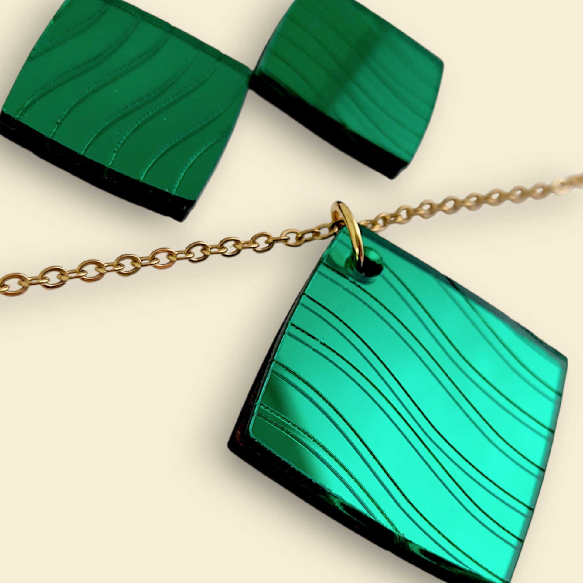 Material: Metacrilato espejo grabado, madera de nogal en la trasera y acero inoxidable.
